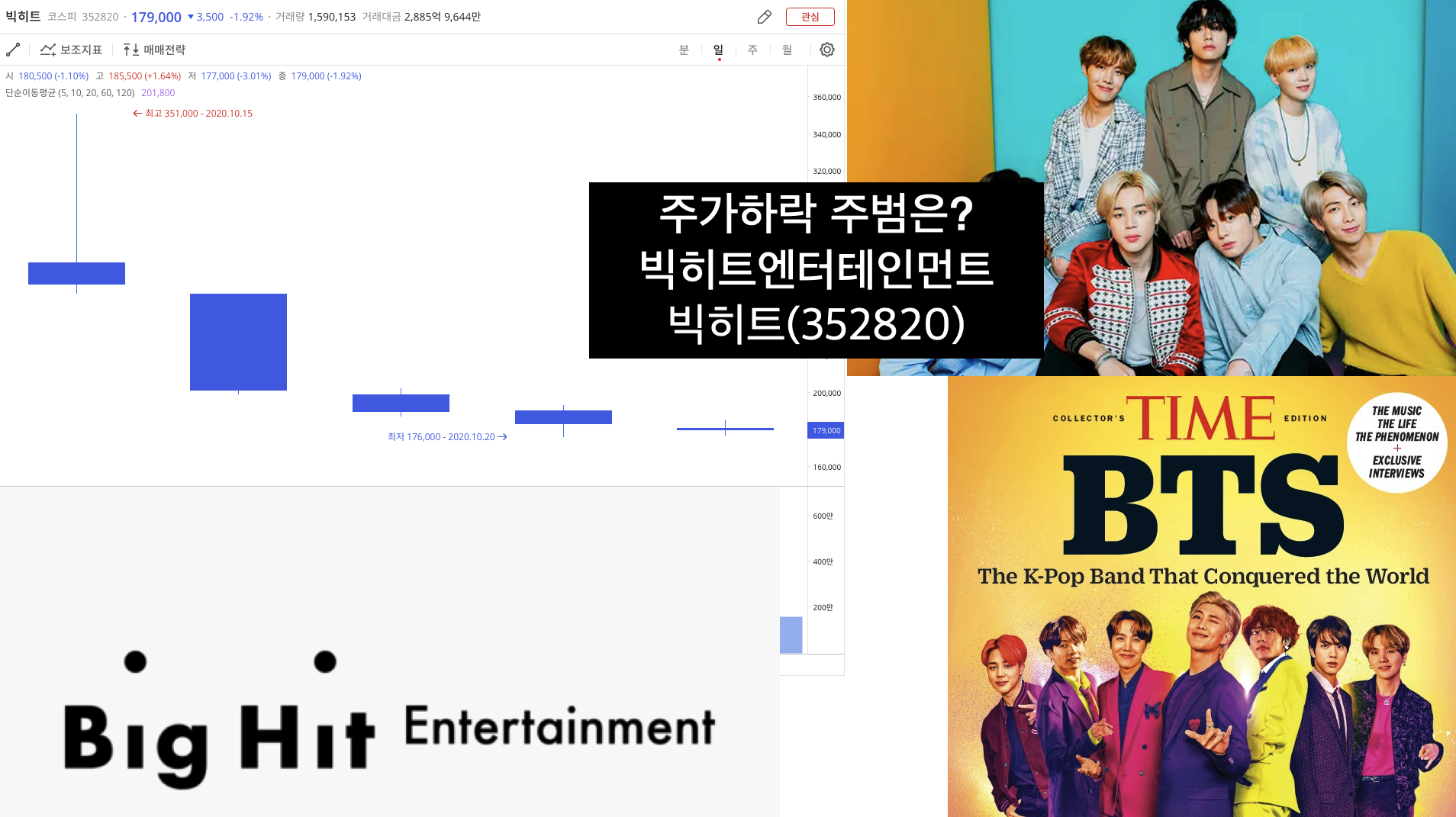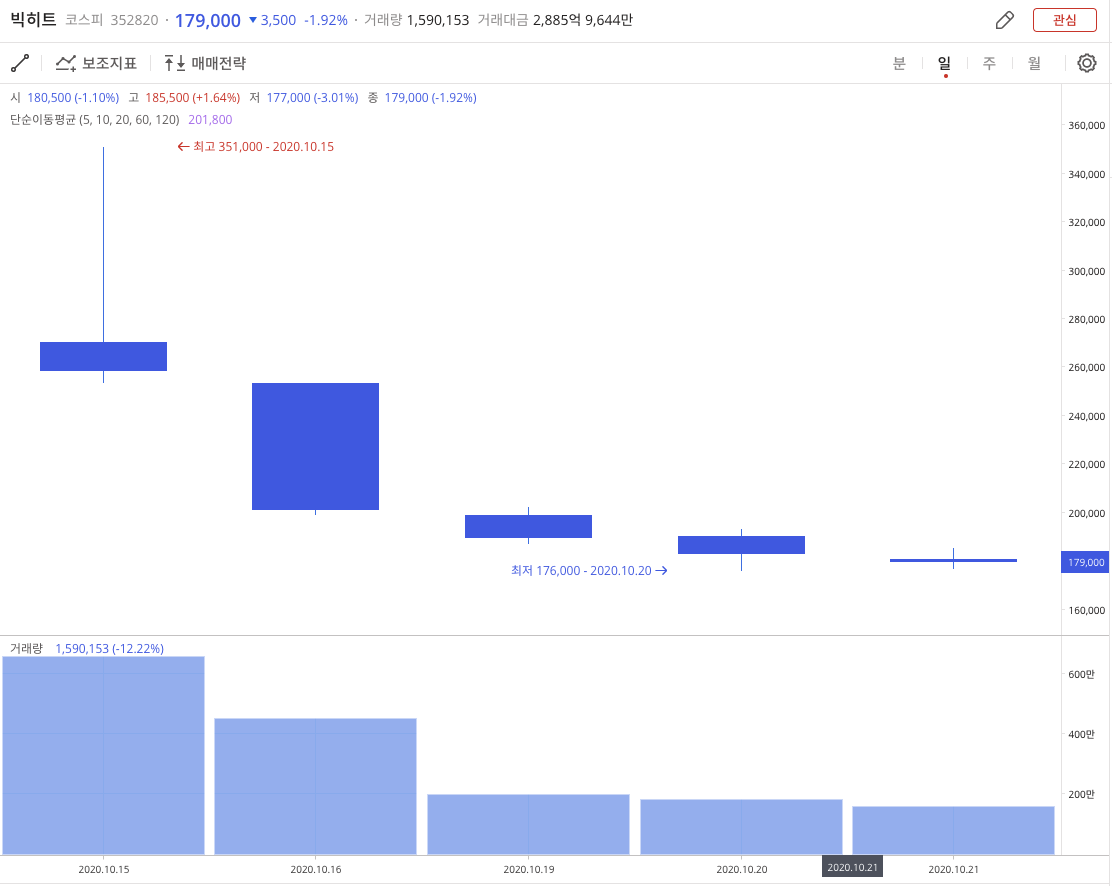 빅히트는 상장일인 2020년 10월 15일 최고점 351,000원을 찍고 5일 연속 하락을 해서 2020년 10월 21일 179,000원으로 장을 마감했습니다.