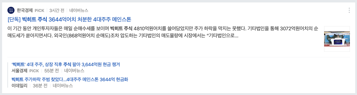 빅히트 주가 하락 주범 찾았다 라는 기사 제목을 봤습니다. 4대주주 메인스톤 3644억 현금화했다고 합니다.
