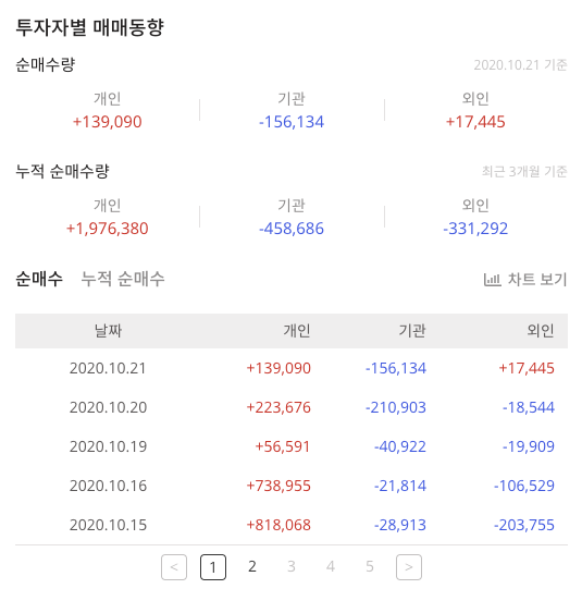 투자자별 매매동형은 5일동안 개인은 매수를 했으며 기관과 외인은 매도를 했습니다.