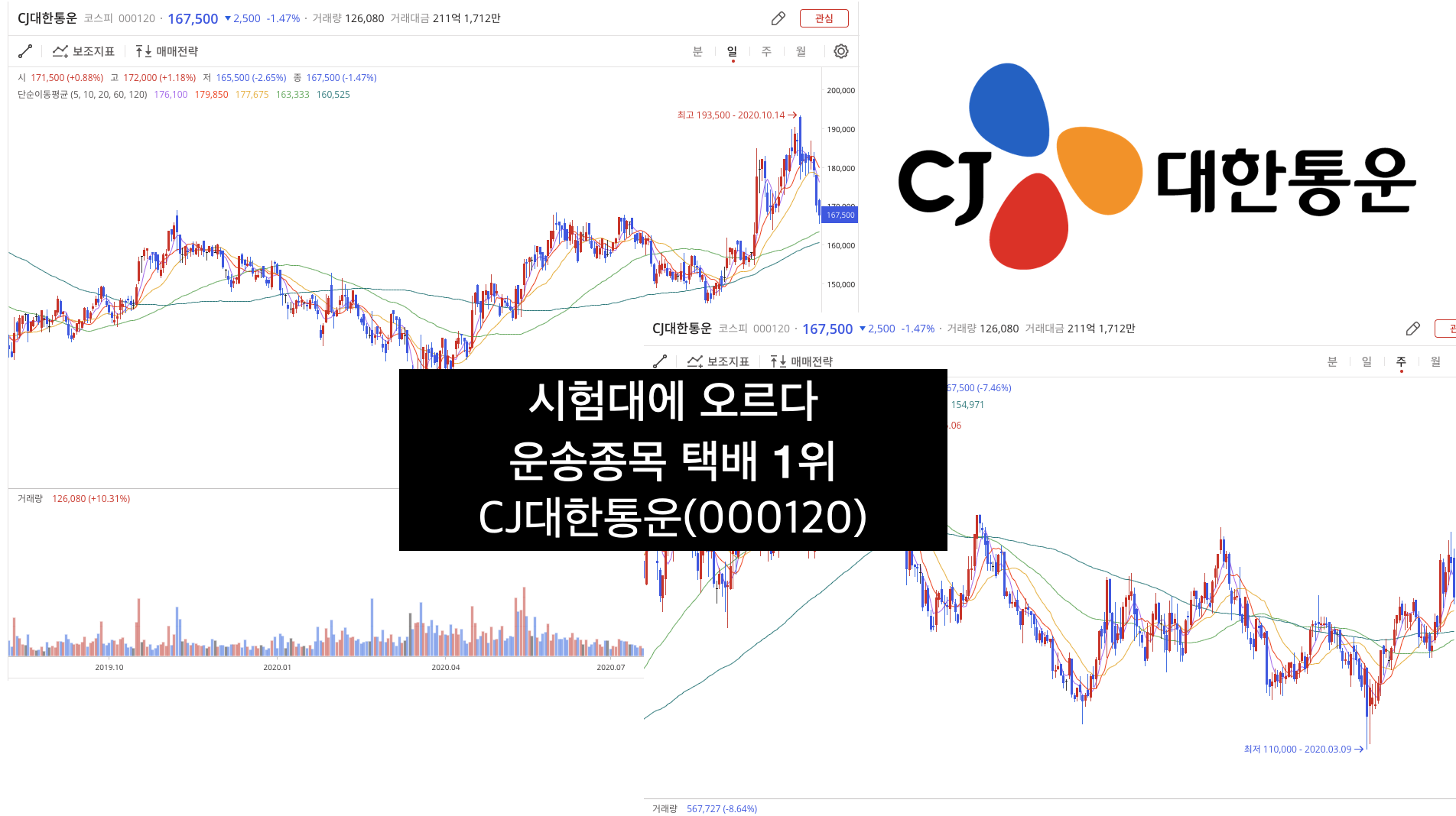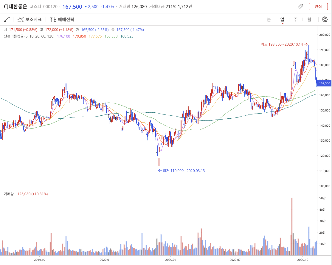 주봉으로 본 CJ대한통운 입니다. COVID-19로 2020년 3월 저점 110,000원을 찍고 두배정도 오르다가 직원에 과로사로 대표이사 사과 및 택배 대책으로 영향이 있는듯 합니다.