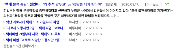 2020년 9월 17일 택배 분류 중단 선언에 왜 추석 앞두고 vs 정당한 대가 받아야 라는 기사제목을 볼 수 있습니다. 그리고 추석 앞두고 하는 이유는 노조에 대한 이해가 있다면 충분한 행동이라 생각됩니다.