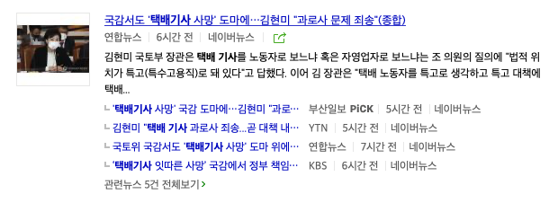 2020년 10월 23일 국감서도 택배기사 사망 도마에 김현미 과로사 문제 죄송이라는 기사제목을 볼 수 있습니다.