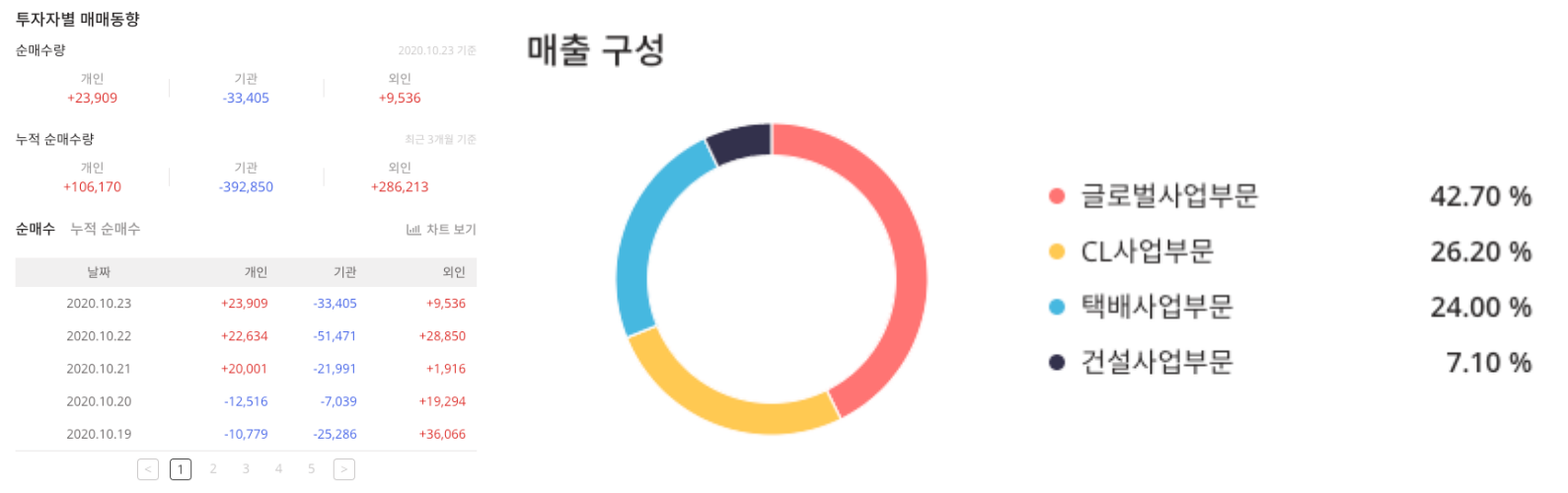 CJ대한통운(000120)은 계약물류, 택배사업, 항공포워딩, 해상포워딩 등 화물운송을 주된 사업으로 영위하고 있으며, 당일 배송서비스, 물류 자동화 등의 서비스를 통해 경쟁우위를 갖추고 있으며 최근 3개월 누적 순매수량은 외인과 개인이 주식을 매수했습니다.