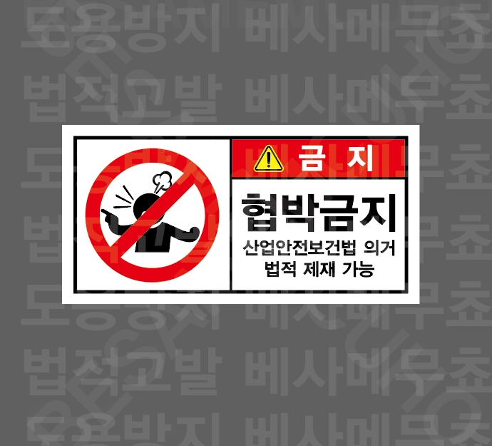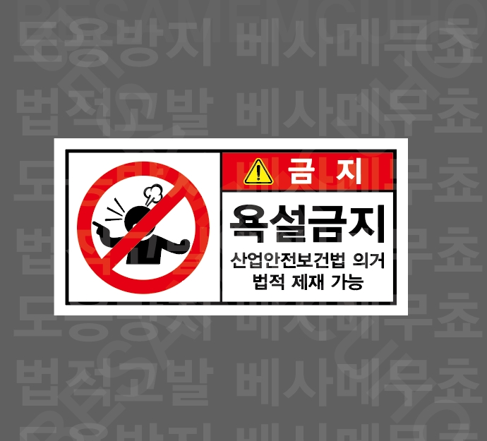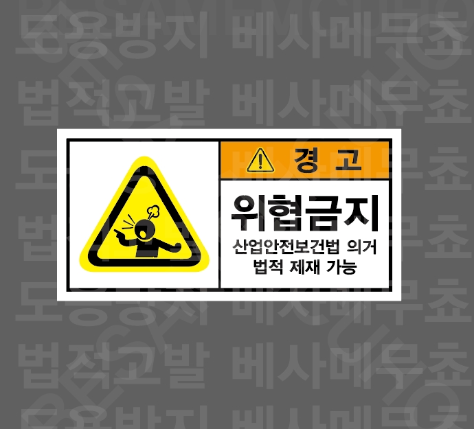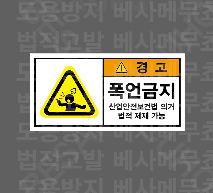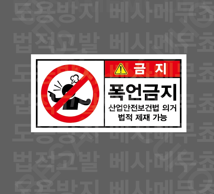 화기금지 화재 및 폭발 위험 드론 비행 금지 NO DRONE ZONE 촬영금지 NO PHOTOGRAPHY 과속금지 지게차 지정속도 준수 과속금지 차량 지정속도 준수 계단주의 STAIRS HAZARD 계단주의 STAIRS HAZARD 통제구역 NO ENTRY UNLESS AUTHORIZED 온도관리 PLEASE COLSE THE DOOR 손잘림 주의 CAUTION WATCH YOUR HAND 손말림 주의 톱날주의 칼날 주의 걸려 넘어짐 주의 발빠짐 주의 부딪힘 주의 폭언금지 협박금지 폭언금지 법적 제재 가능 욕설금지 법적 제재 가능 위협금지 법적 제재 가능 정리정돈 작업 후 정리정돈 2인1조 작업 정격하중 준수 고온주의 비닐접착기 접착면 고온주의 끼임주의 위험반경 작업 반경 내 접근금지 출입금지 작업 반경 내 접근금지 충돌주의 작업 반경 내 접근금지 감전주의 방호장치 확인 손조심 허리조심 1000매 산업안전보건표지