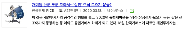 개미들 한푼 두푼 모아서 삼전 주식 모으기 운동이라는 기사제목이 보입니다.