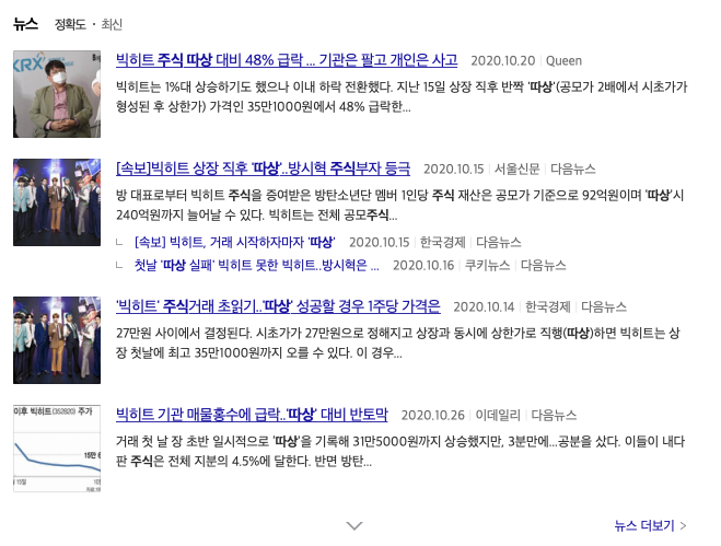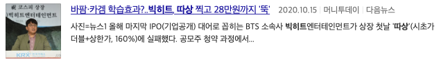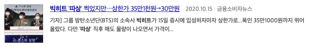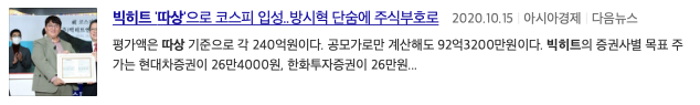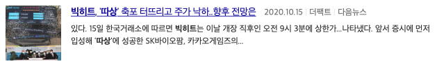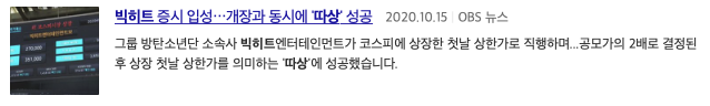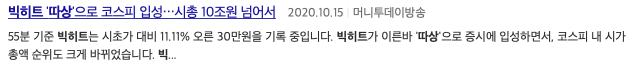 빅히트 증시 입성 개장과 동시에 '따상' 성공 OBS뉴스 , 빅히트 '따상'으로 코스피 입성 방시혁 단숨에 주식부호로 아시아경제, 빅히트 '따상'으로 코스피 입성 시총 10조원 넘어서 라는 기사 제목을 볼 수 있습니다.
