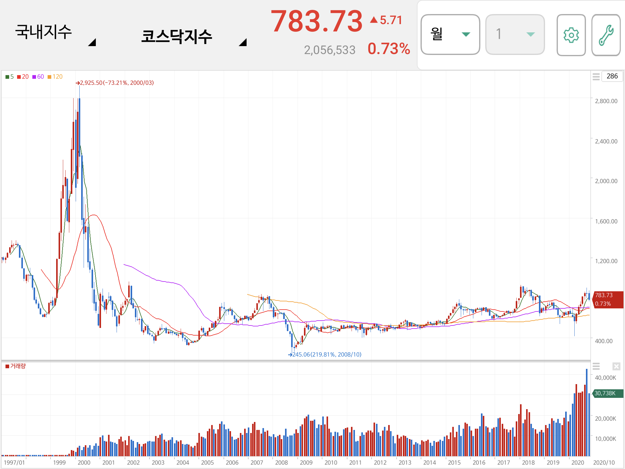 아래는 국내지수중 코스닥지수 입니다. 2000년 3월에 코스닥지수가 2,925.50을 찍고 2008년 10월에 245.06을 찍고 현재 코스닥 지수는 783.73입니다.