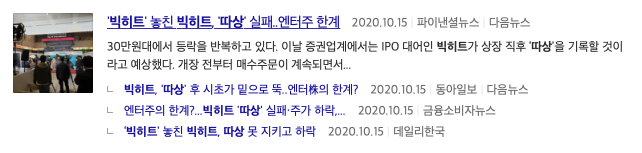 마지막 기사제목을 하나더 보면 빅히트 놓친 빅히트 따상 실패 엔터주 한계 파이낸셜뉴스 기사제목을 볼 수 있습니다.