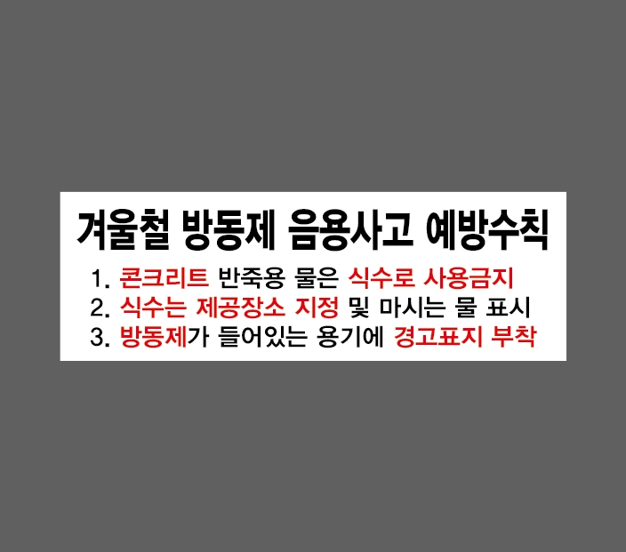 겨울철 방동제 음용사고 예방수칙 콘크리트 반죽용 물은 식수로 사용금지 식수는 제공장소 방동