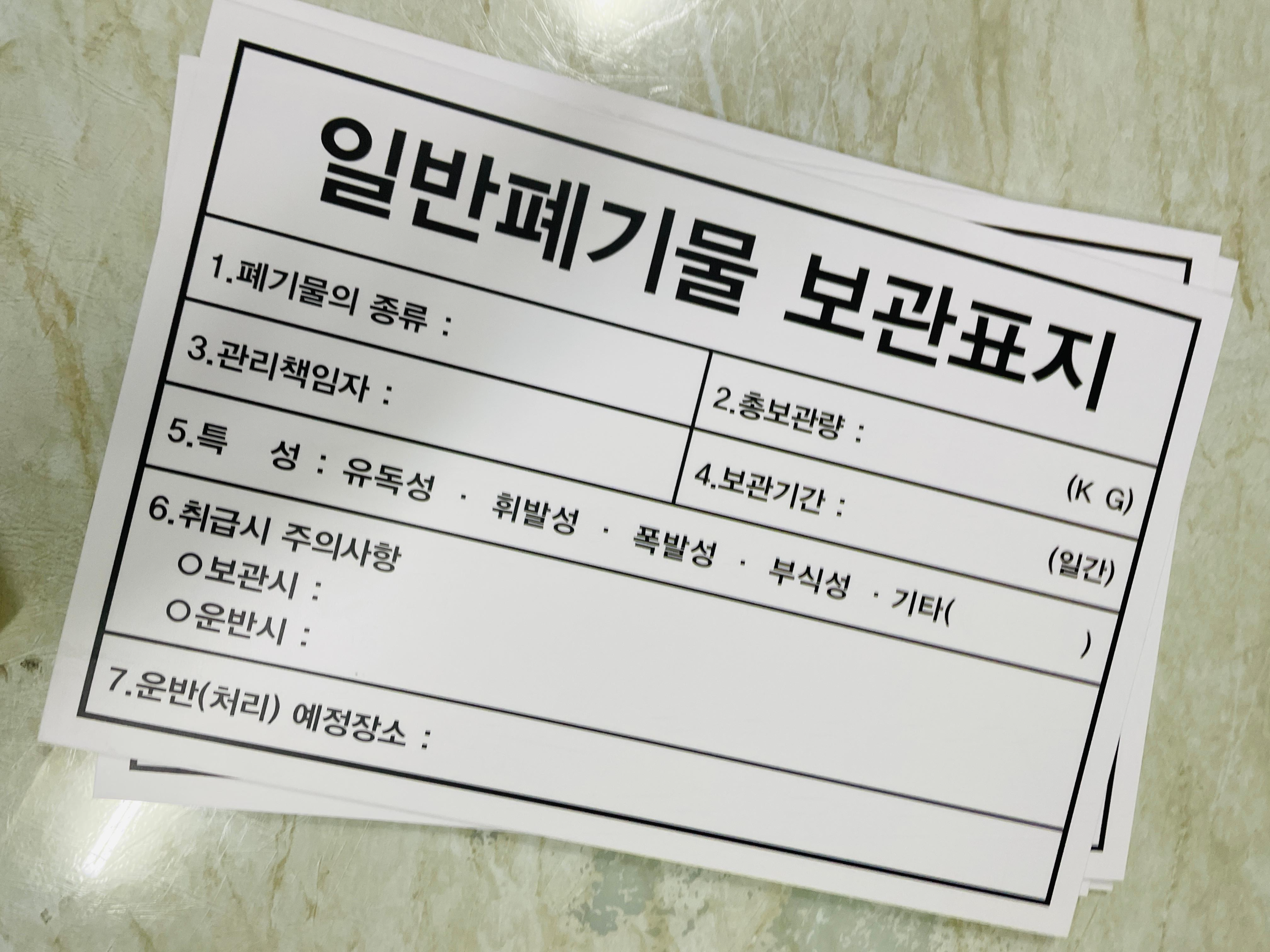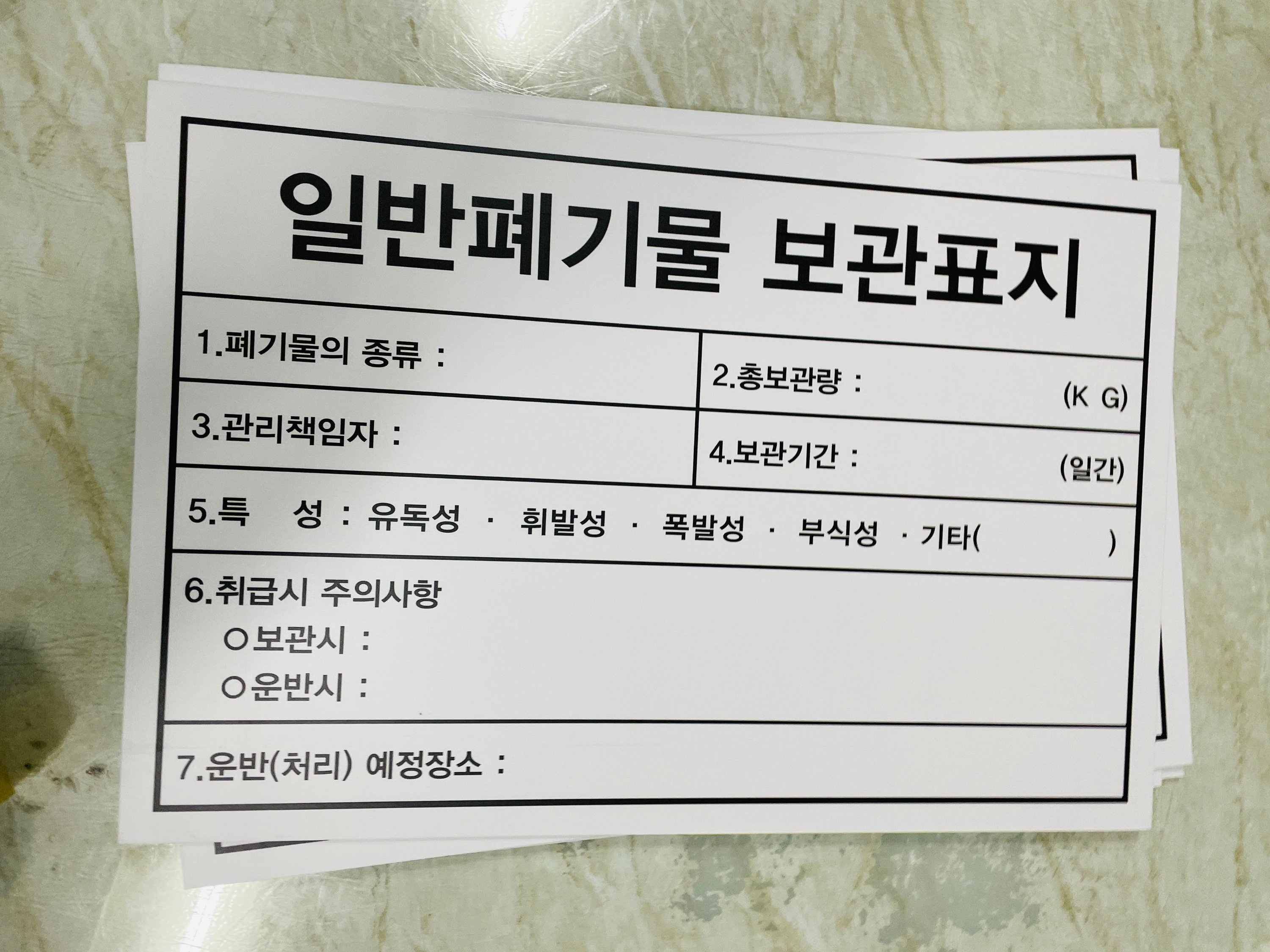 일반폐기물 보관표지 산업스티커 표지판 자석 폐기물의 종류 총보관량 관리책임자 보관기간 특석 유독성 휘발성 폭발성 부식성 기타 취급시 주의사항 보관시 운반시 운반 처리 예정장소 기록 기재