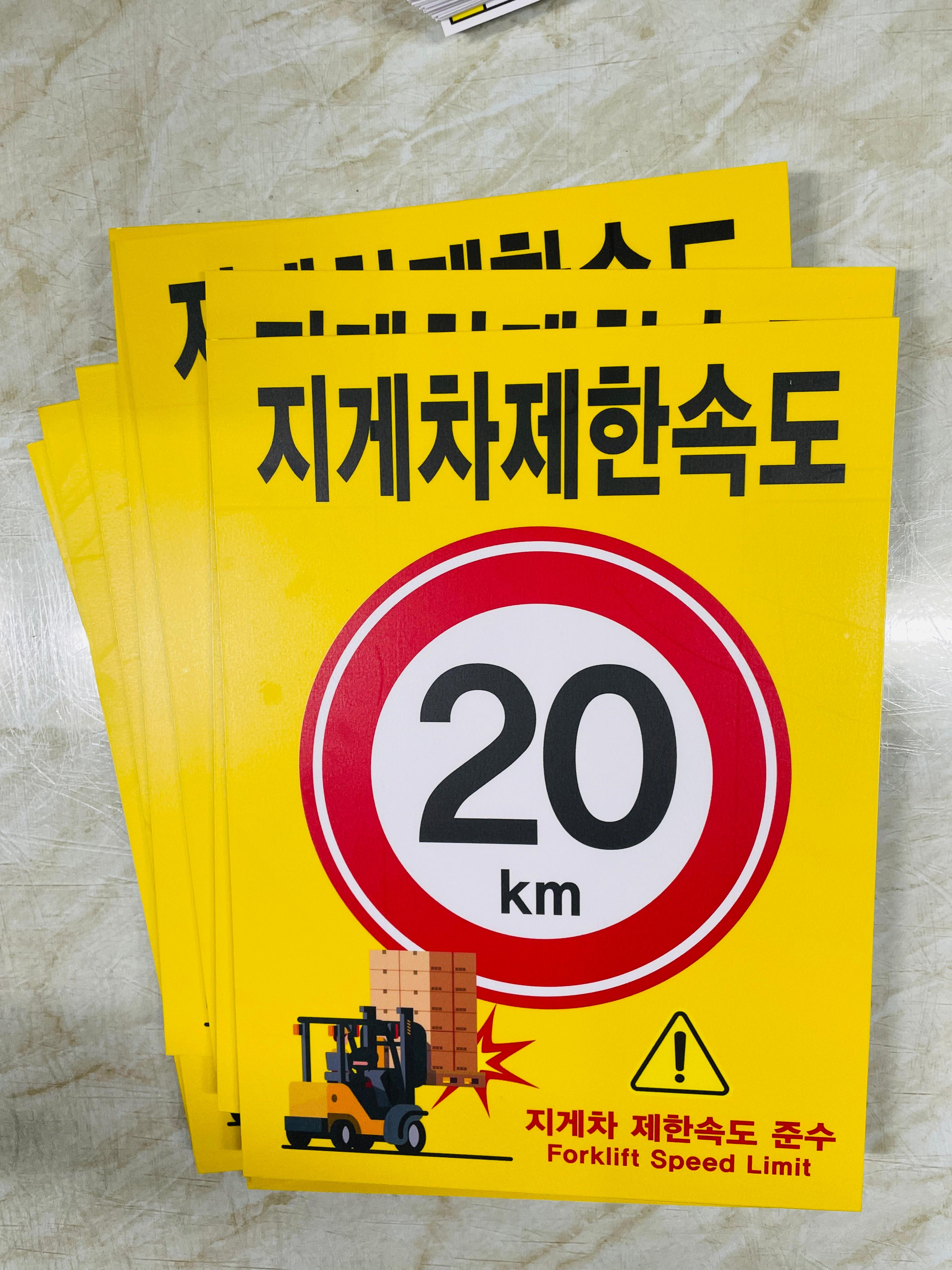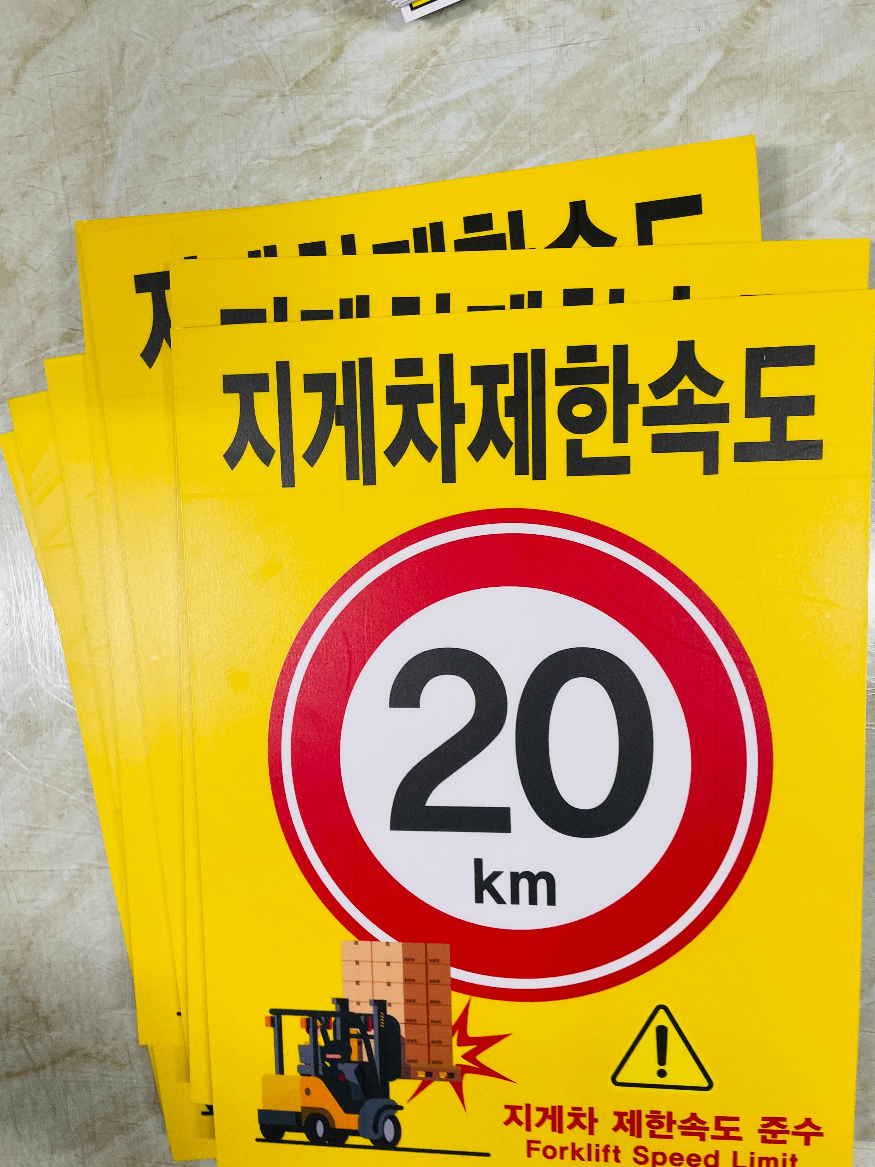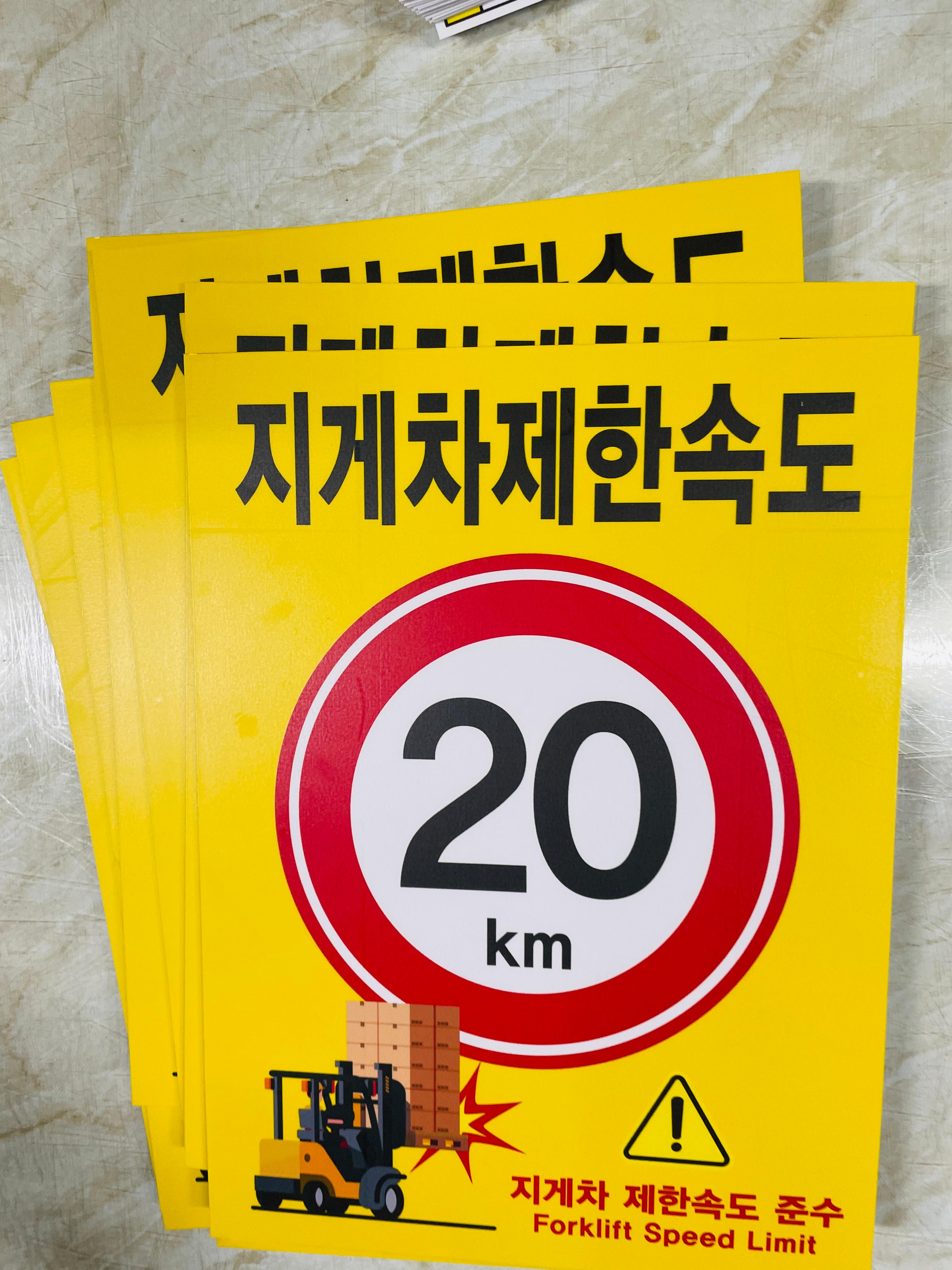 지게차제한속도 20km 노란배경 산업스티커 표지판 자석 FORKLIFT SPEED LIMIT 지게차 제한속도를 준수해주세요 지게차의 빠른 속도로 보행자와 부딪힐 수 있어 표지를 부착하여 최대속도를 제한하여 안전사고를 예방합니다.