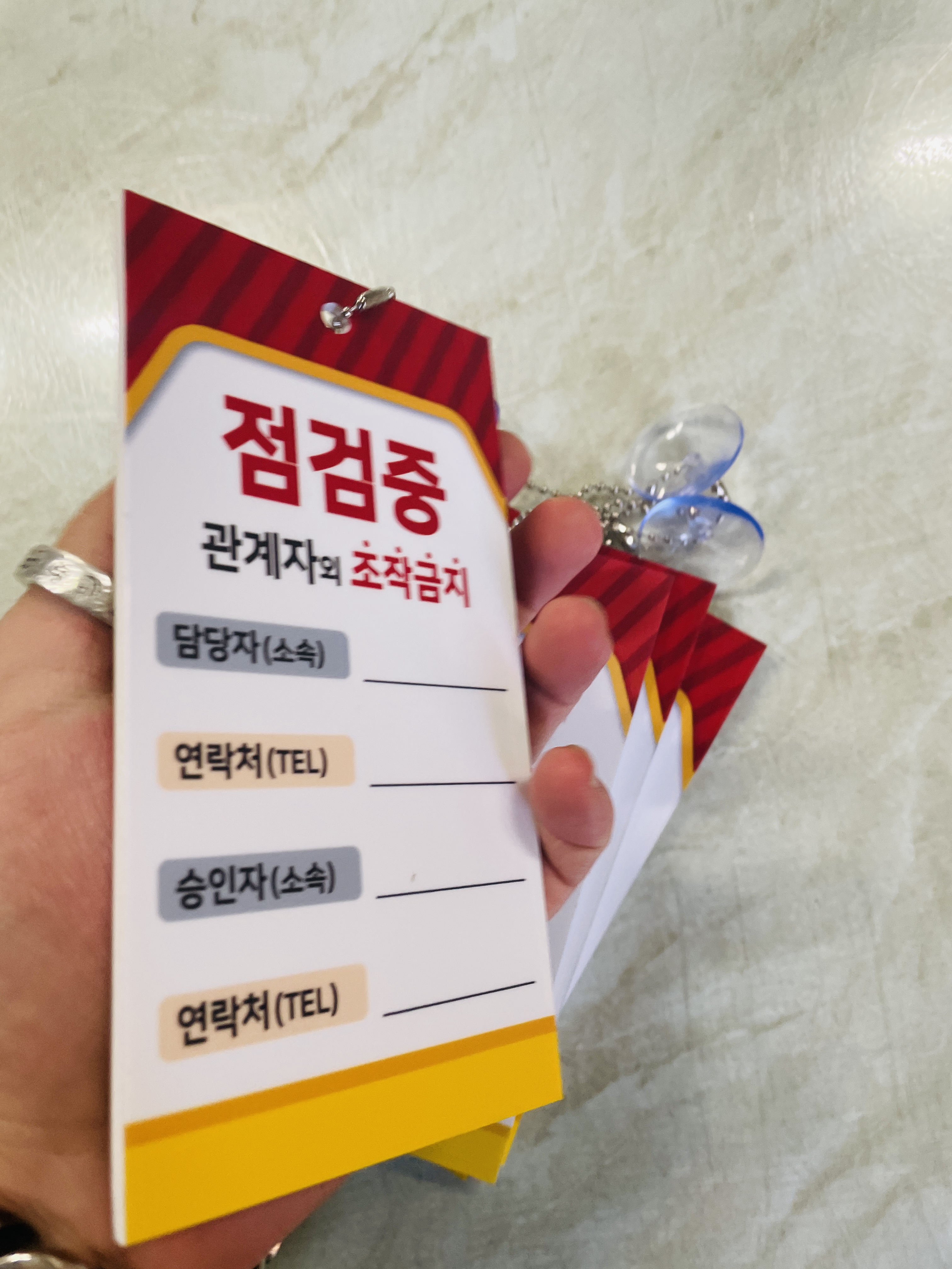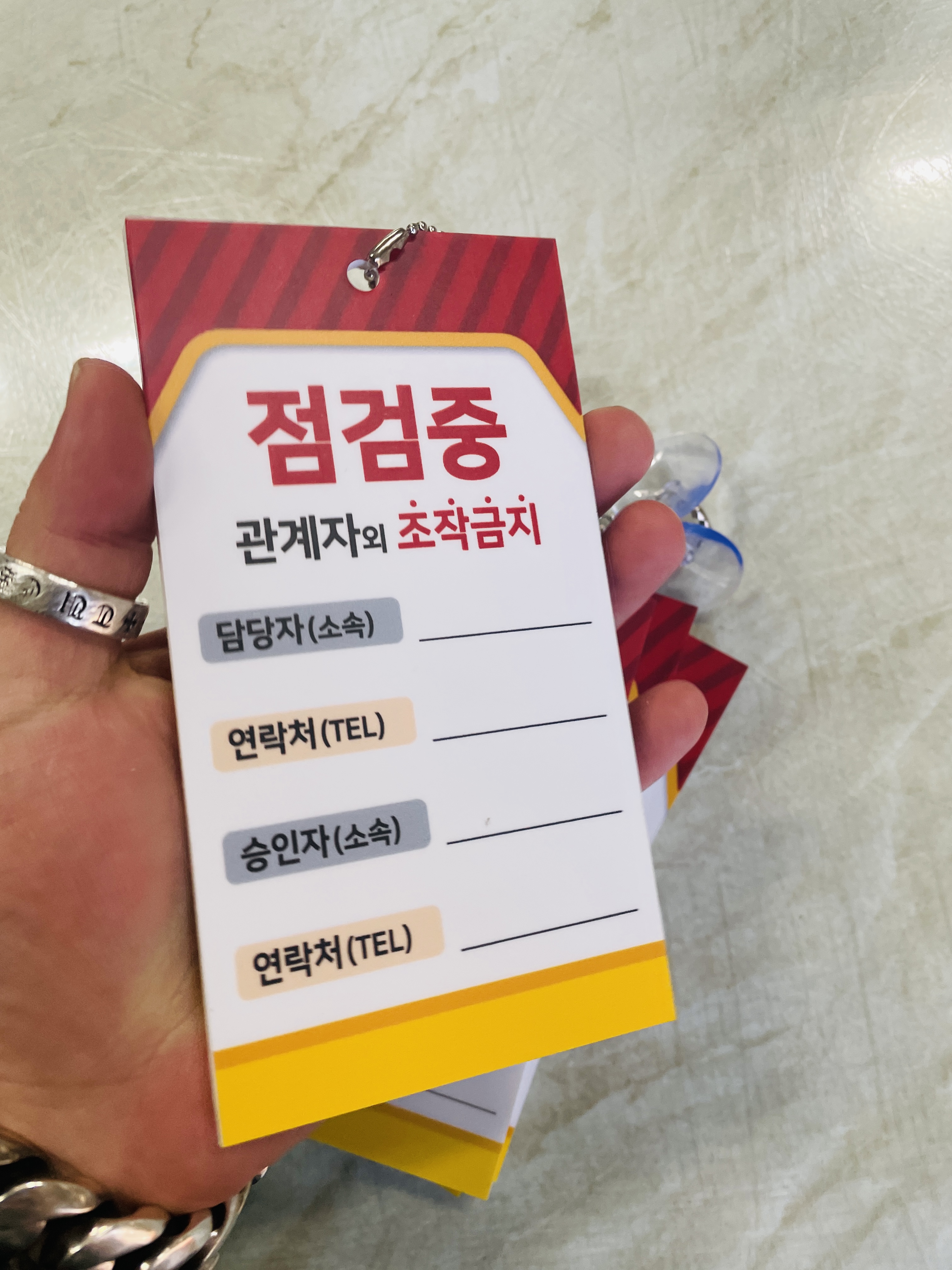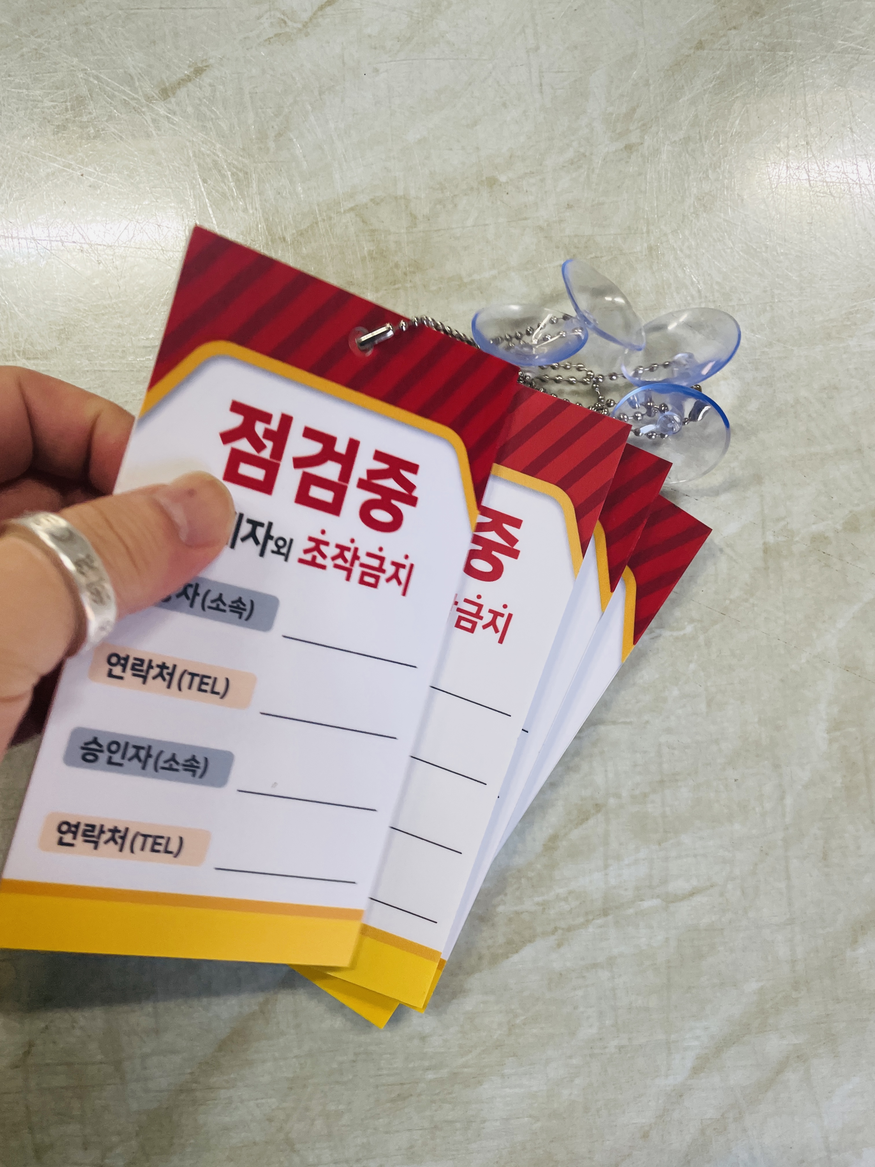 점검중 조작금지 안전작업수칙 관계자 담당자 연락처 승인자 연락처 표지판 걸이형 태그 : 베사