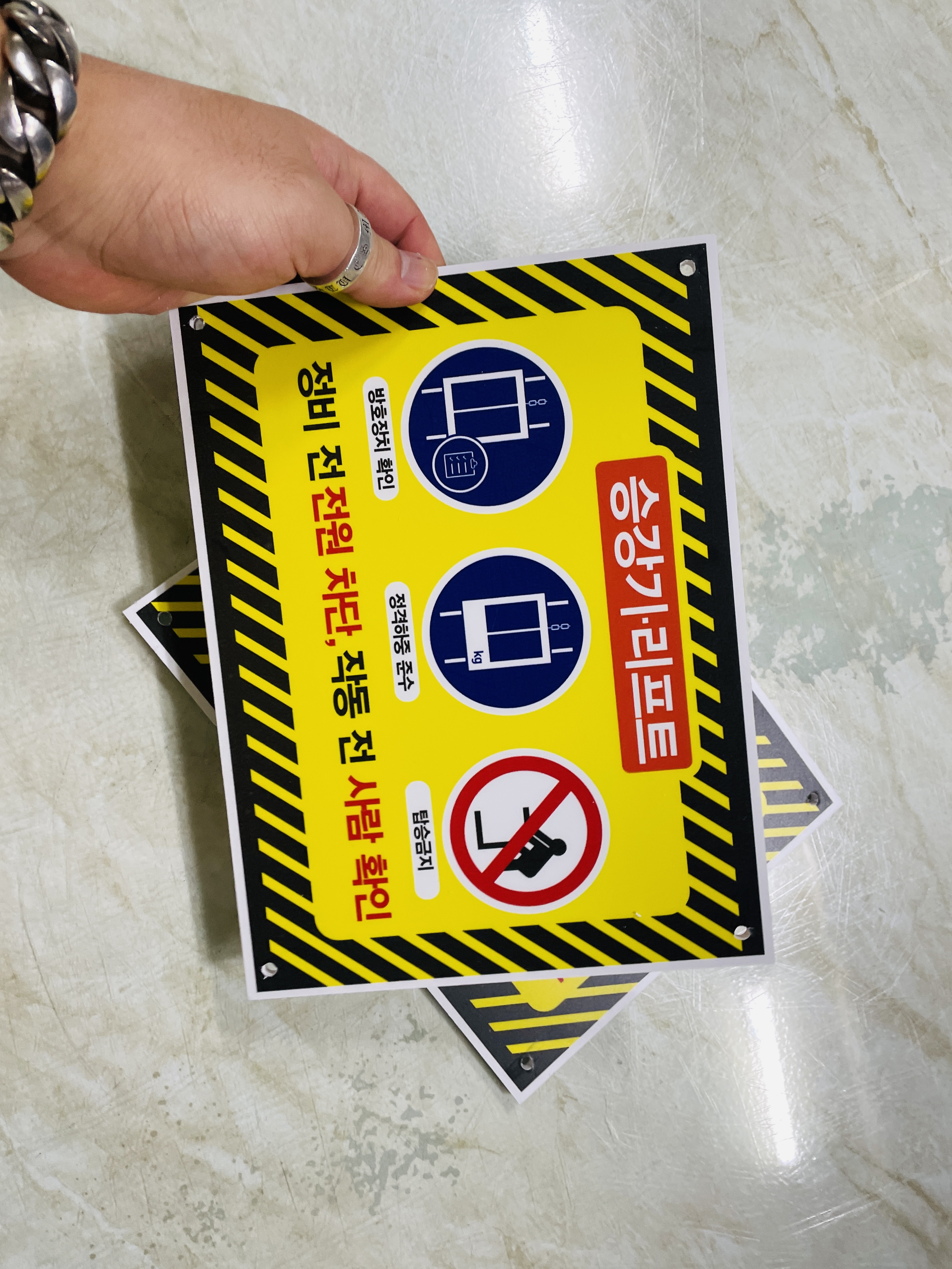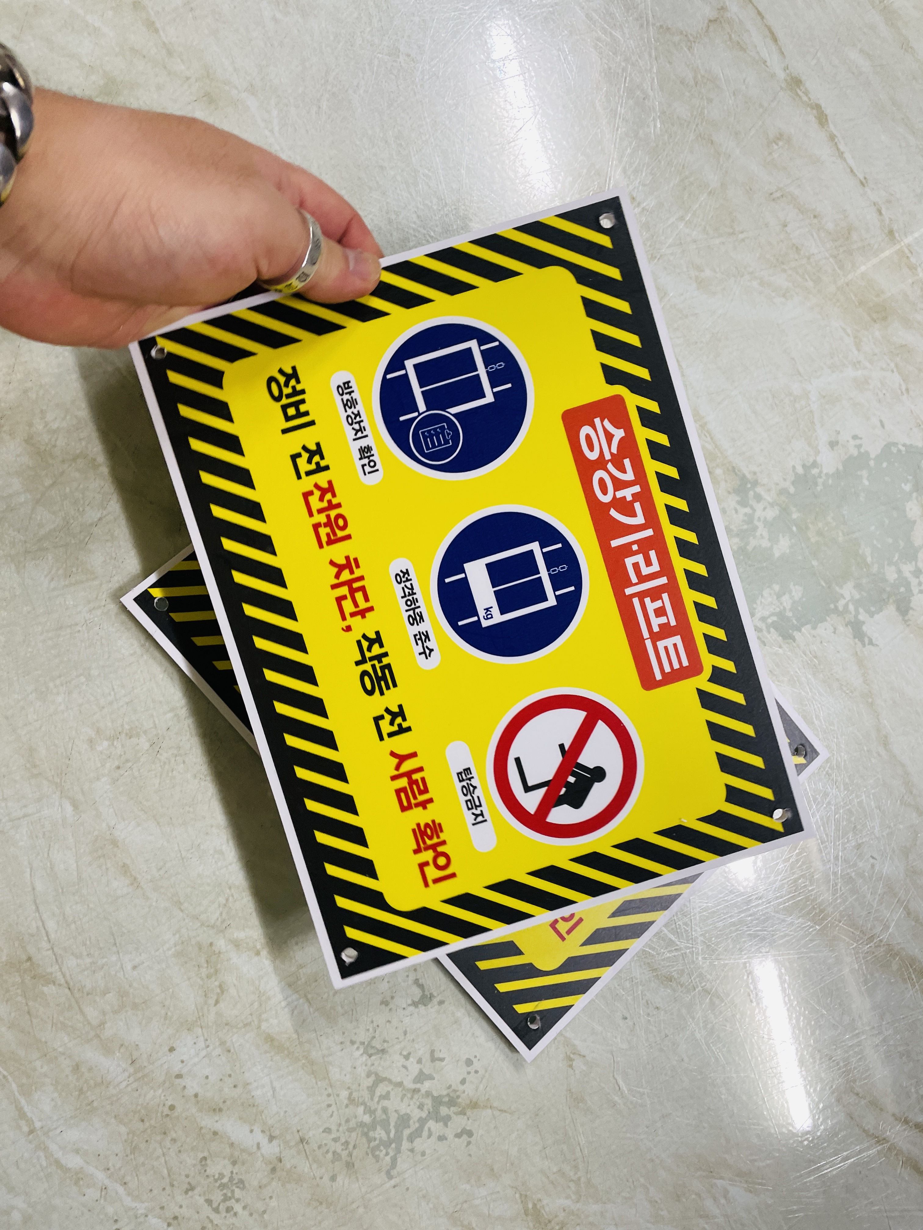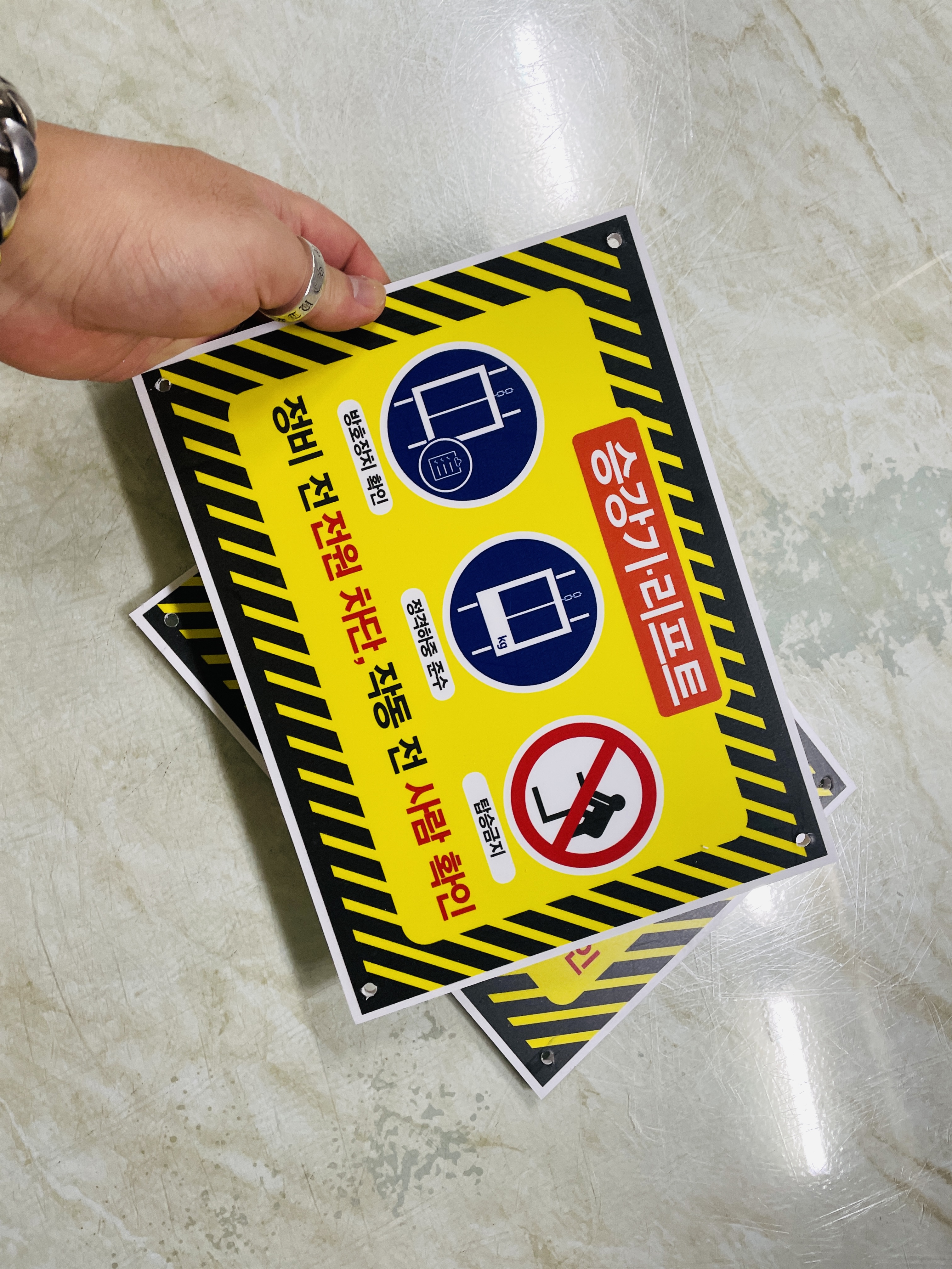 승강기 리프트 방호장치 확인 적격하중 준주 탑승금지 경고 표지판 : 베사메무쵸
