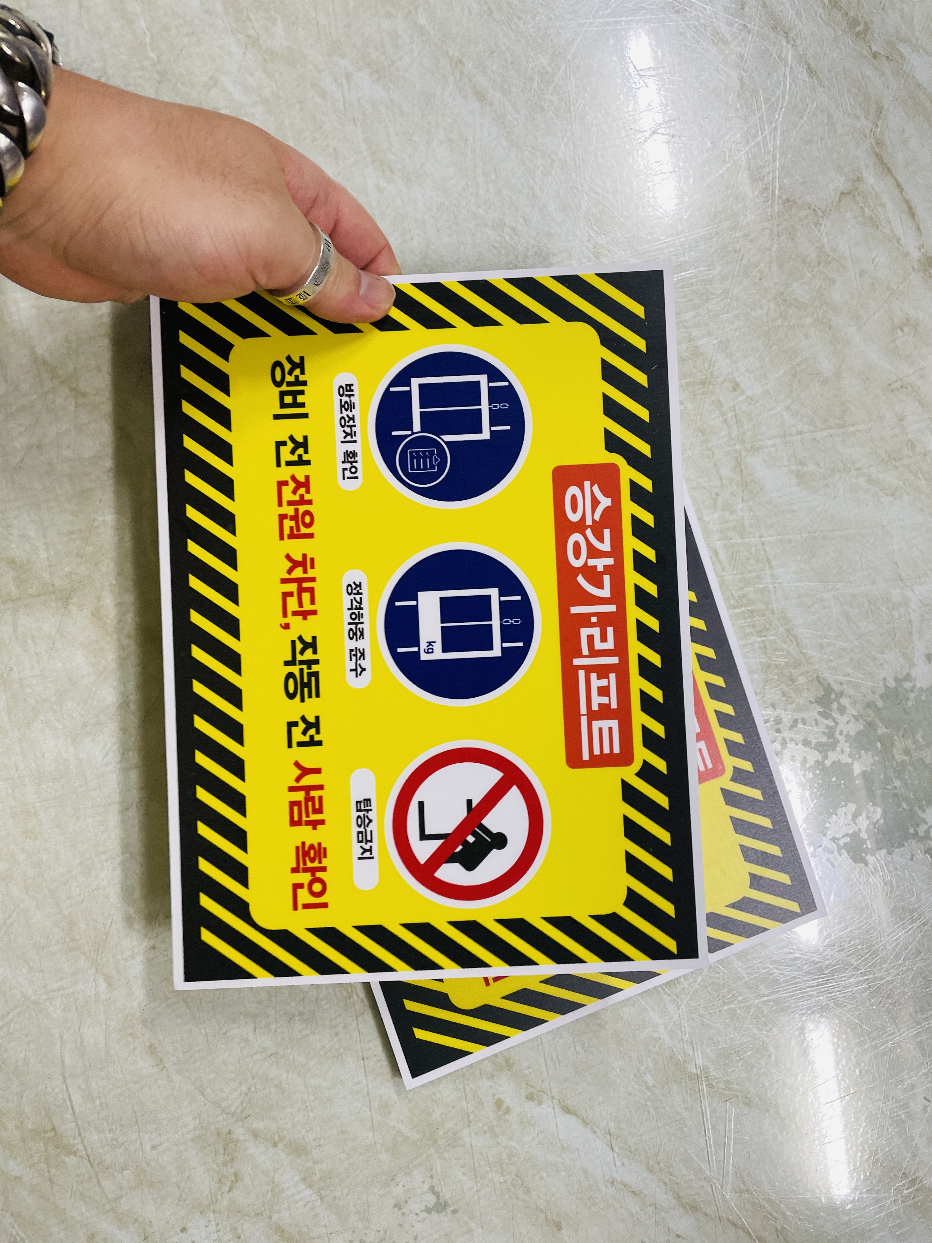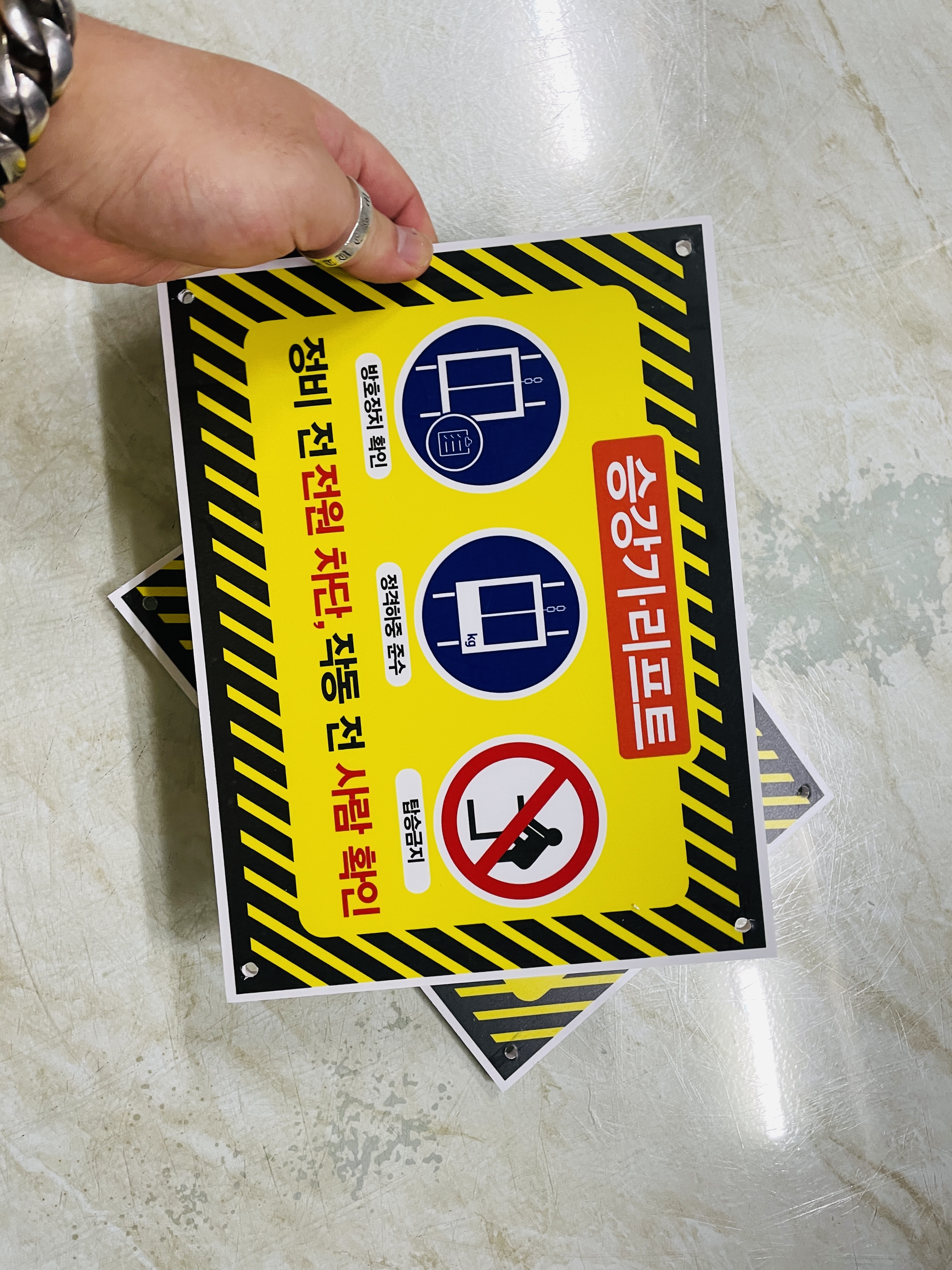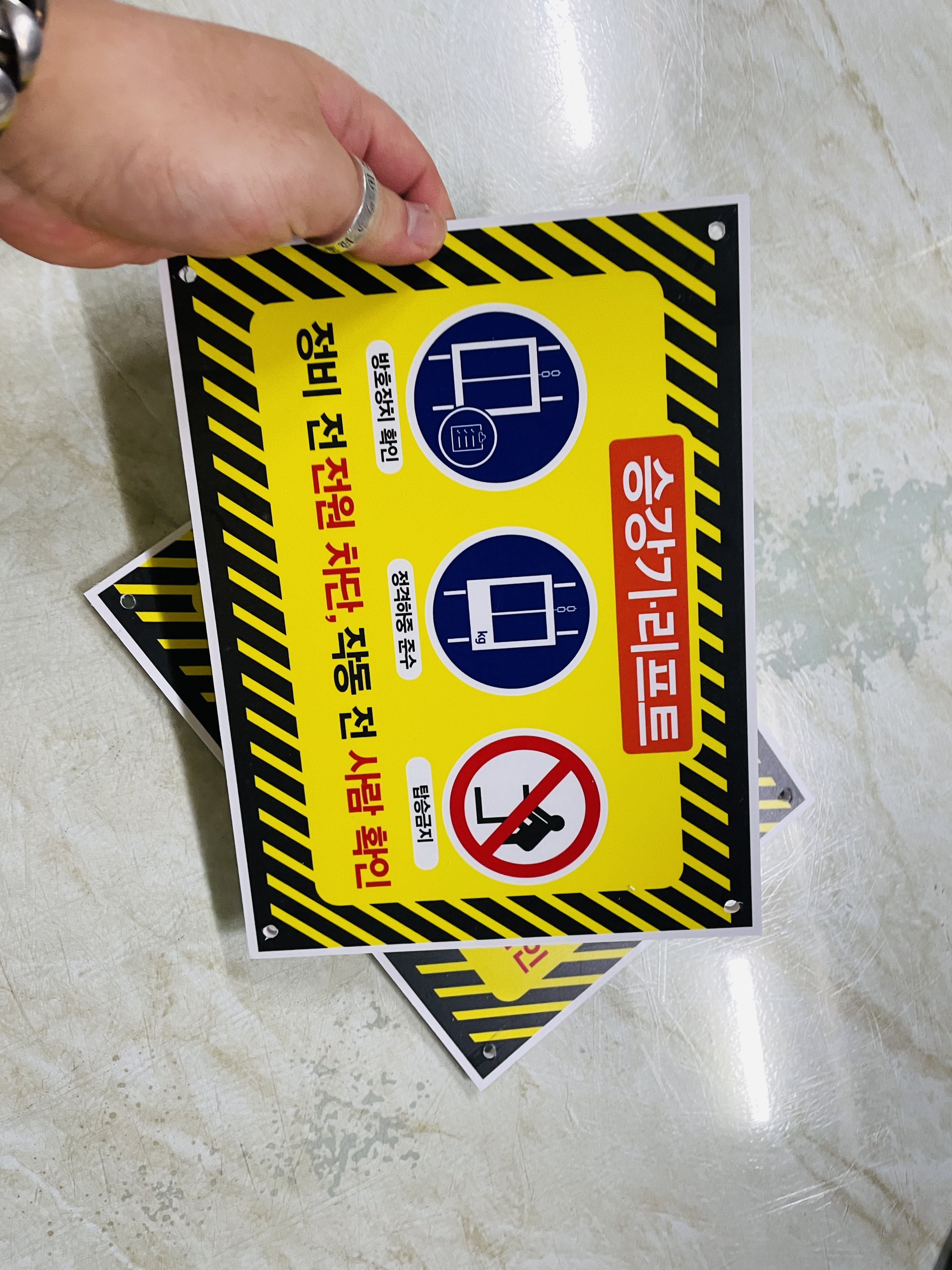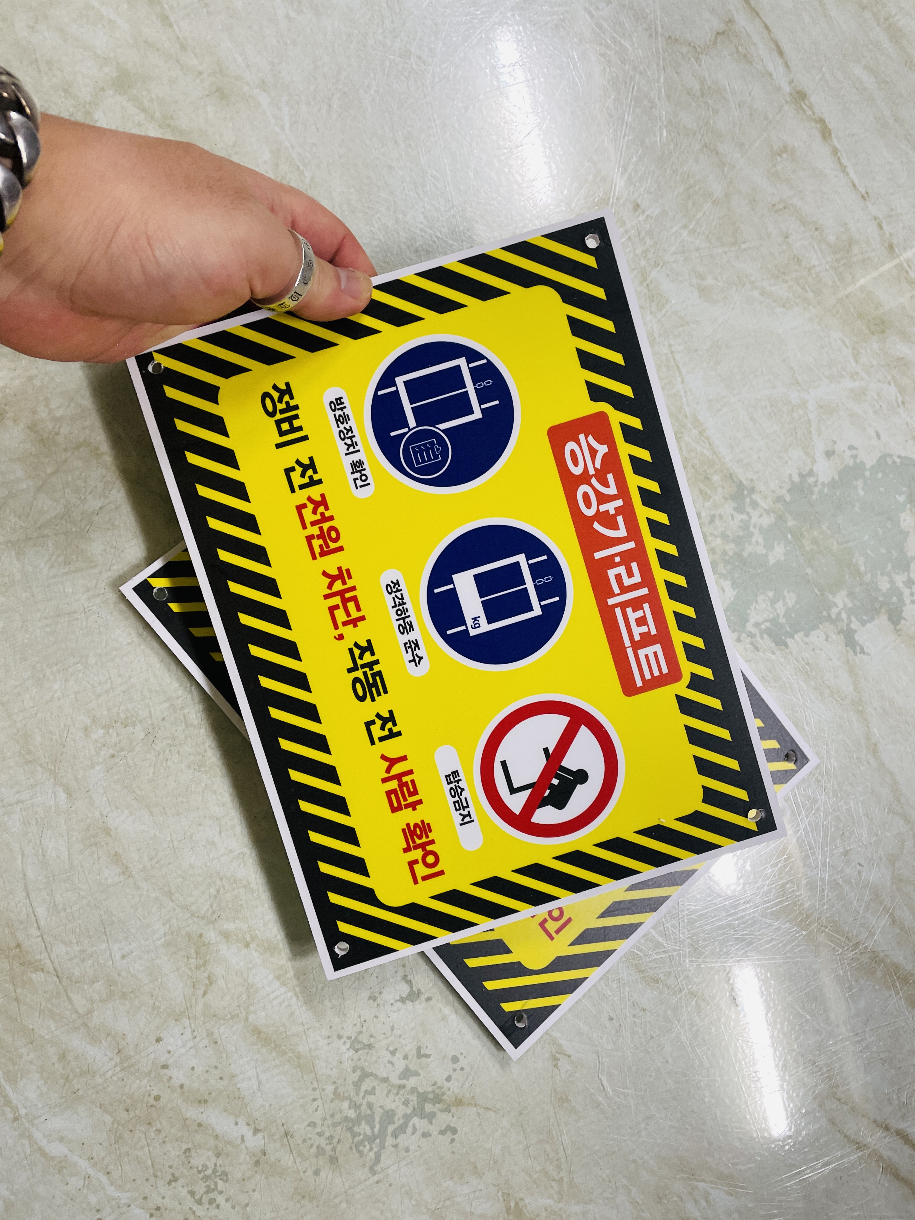 승강기 리프트 방호장치 확인 적격하중 준주 탑승금지 경고 표지판 : 베사메무쵸
