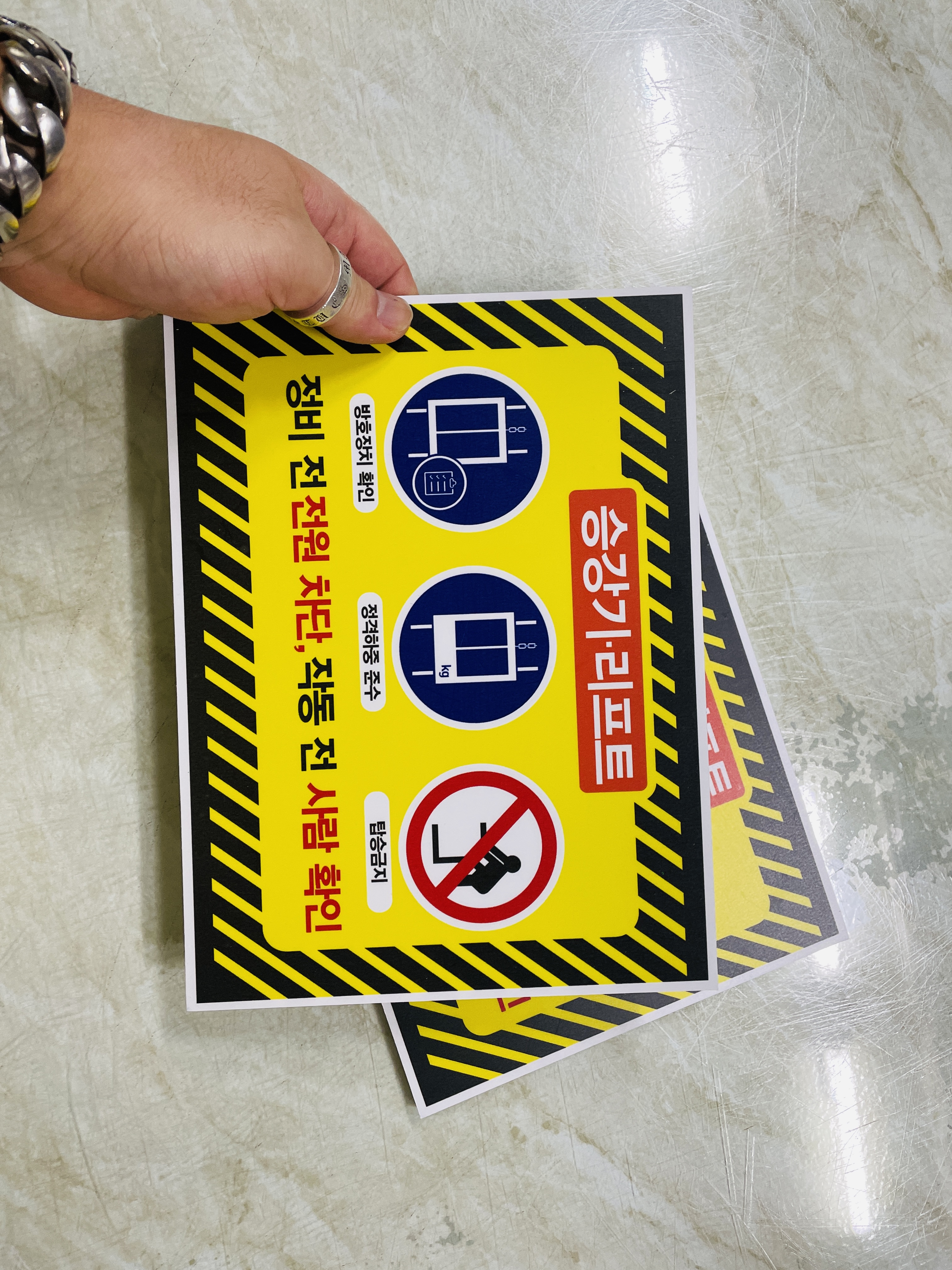 승강기 리프트 방호장치 확인 적격하중 준주 탑승금지 경고 표지판